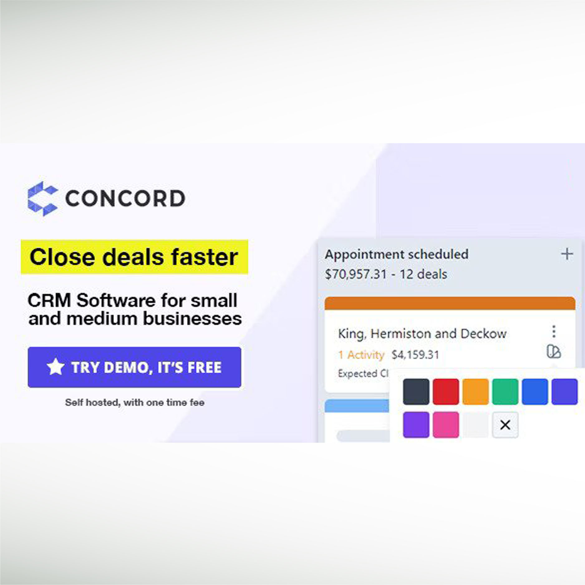Concord is an affordable self-hosted CRM web-based application, with a one-time fee and can help your company to easily manage and organize deals/leads, contacts, and companies, and have a clear overview of the next actions that need to be taken to successfully close a sale.