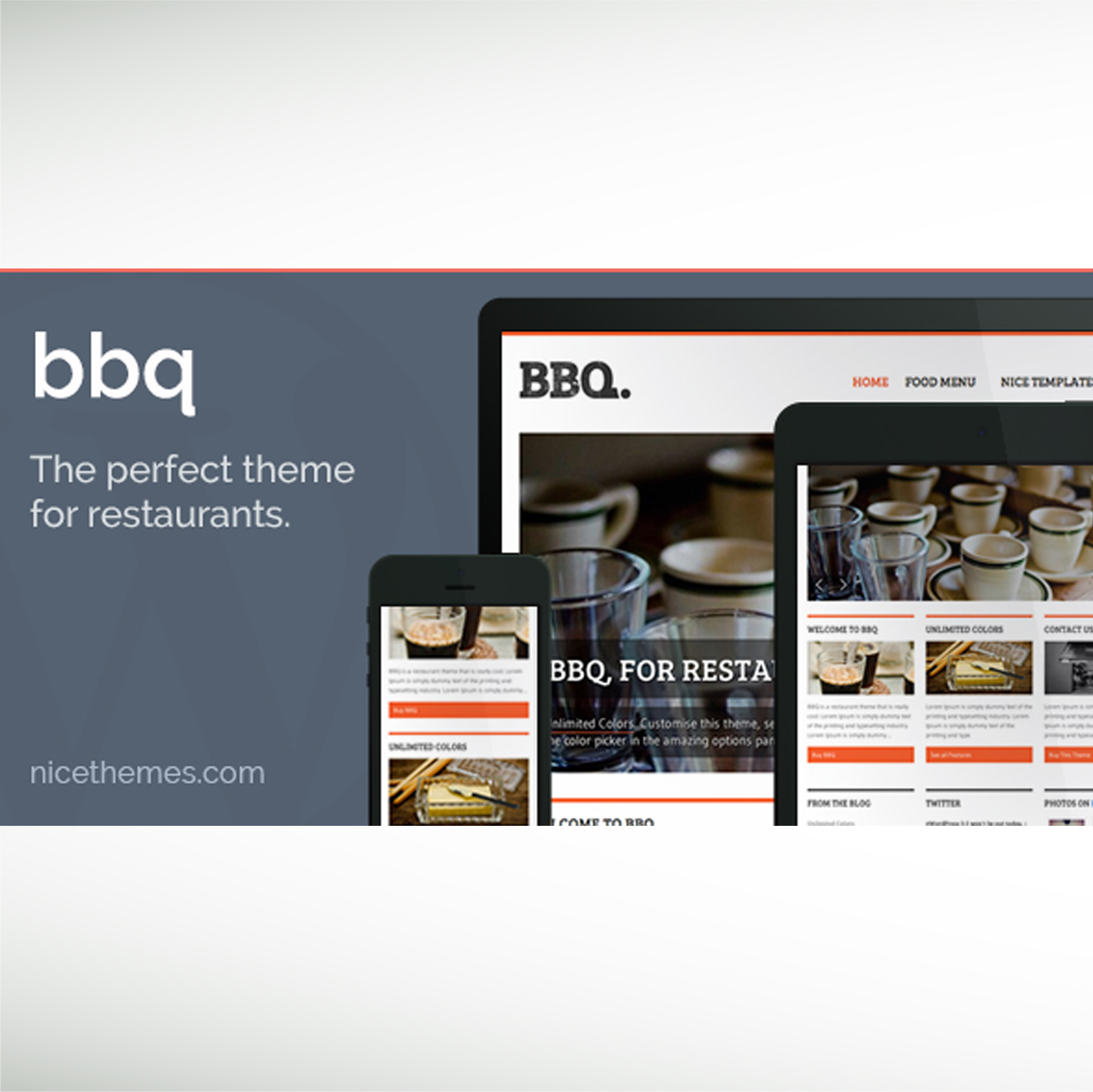 BBQ, the perfect WordPress theme for any cafe, pub, bar, restaurant or local business. With a unique and minimalistic look, you can easily customize it by uploading your logo and setting your accent color using the color picker in the amazing options panel.