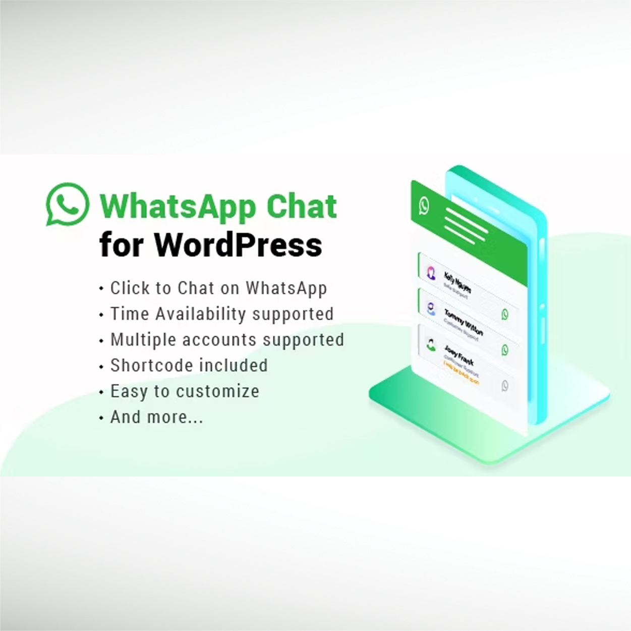 NinjaTeam WhatsApp Chat plugin allows you to add multiple accounts of your members into a WhatsApp box to display. You customer can choose a supporter they want to chat, they know exactly who they are having a conversation.